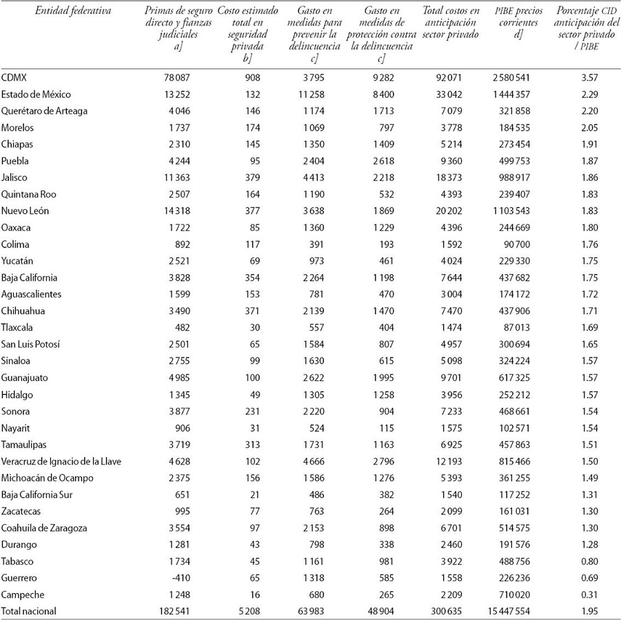 Los resultados se presentan a nivel nacional, aunque alguna información, por ejemplo los gastos de seguridad en estados y municipios, se presentan por entidad federativa. Posteriormente, el mismo autor (Mendoza, 2013a) dando seguimiento al trabajo anterior, incorpora la ENSI-7 para analizar el año 2009. En este trabajo ya incluye más cifras a nivel estatal, aunque no logra establecer una comparabilidad entre las entidades federativas del país.