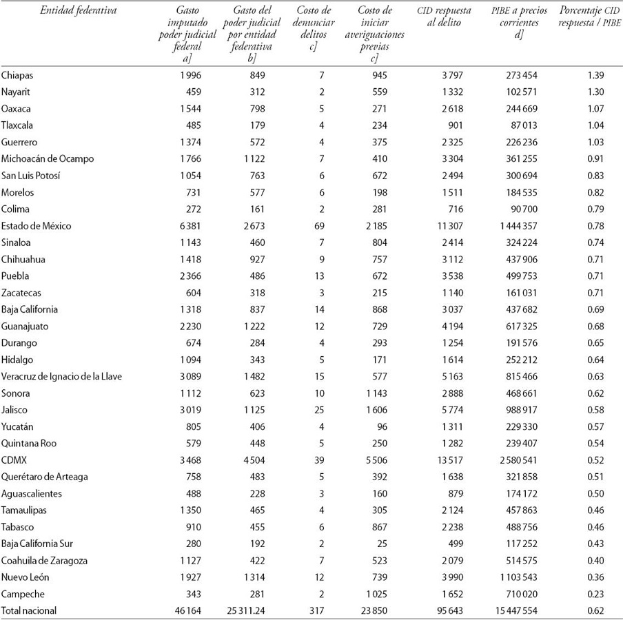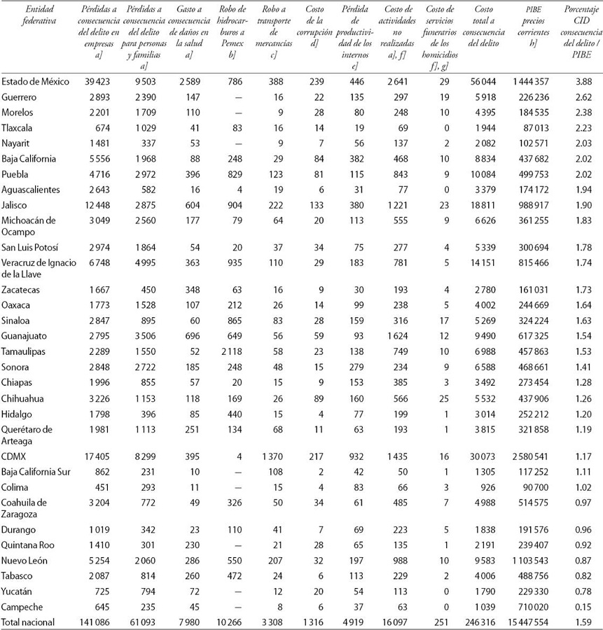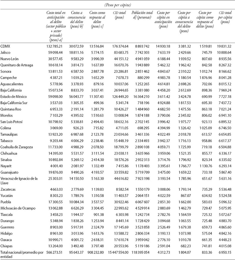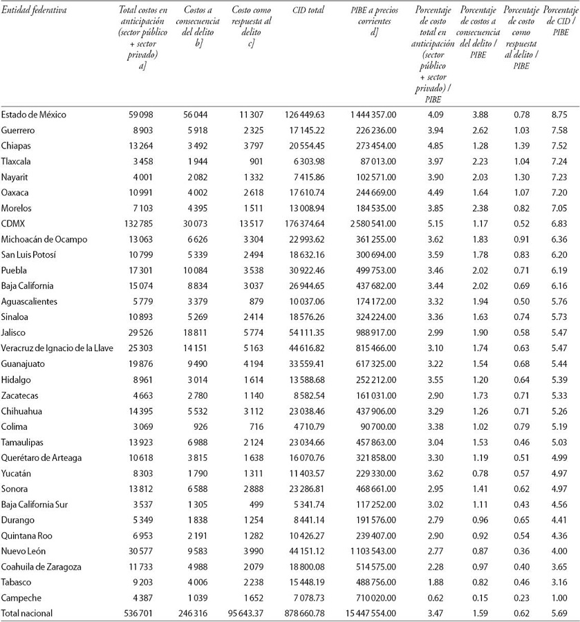 En el presente trabajo se estiman los costos por anticipación de la inseguridad y la violencia, los costos a consecuencia de la inseguridad y la violencia y los costos como resultado de estos fenómenos para cada entidad federativa y posteriormente se comparan con el PIB estatal. De igual forma, se estiman los CID per cápita de las entidades federativas, para analizarlos comparativamente.