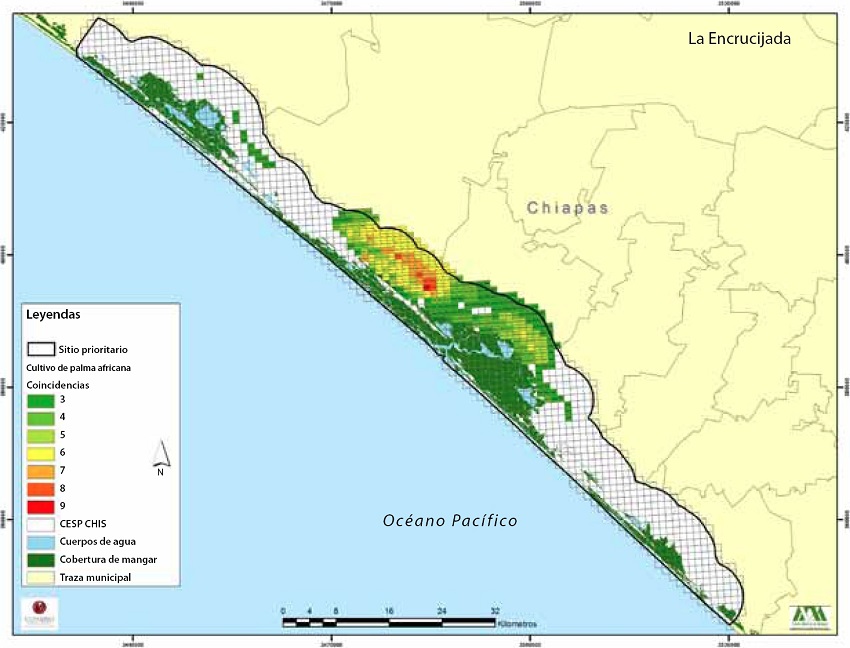 Pues prácticamente la palma está dentro de la zona de manglar, esto es muy crítico. Todo esto que está en blanco [marca un área en el mapa] antes era una isla de vegetación terrestre, ahora está lleno de palma […] Es una presión sobre los humedales, es una presión sobre el sistema lagunares (Académico/16 de mayo de 2013).