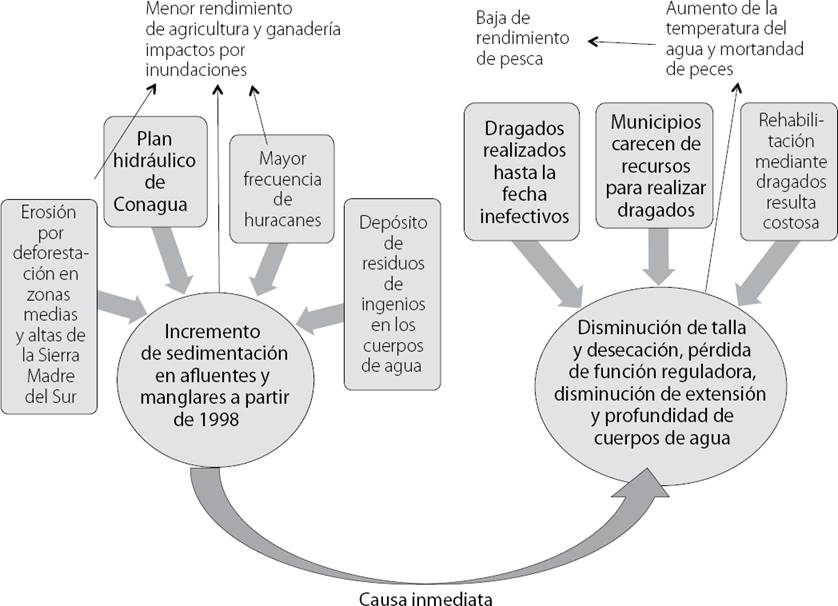 Como señala el Diagrama 1, los expertos coinciden en que el incremento de la sedimentación7 como consecuencia de la rectificación de cauces, observada desde 1998 en los afluentes y los humedales, constituye la principal causa inmediata del deterioro de los manglares de La Encrucijada, ya que desencadenó una disminución progresiva de la talla promedio de los manglares y la pérdida de su función regulatoria para mitigar inundaciones, acompañado de un proceso lento de desecación de los cuerpos de agua del humedal y la reducción de la extensión de las lagunas costeras (véanse elipses en el Diagrama 1).8 Como describe de manera expresiva uno de los entrevistados: