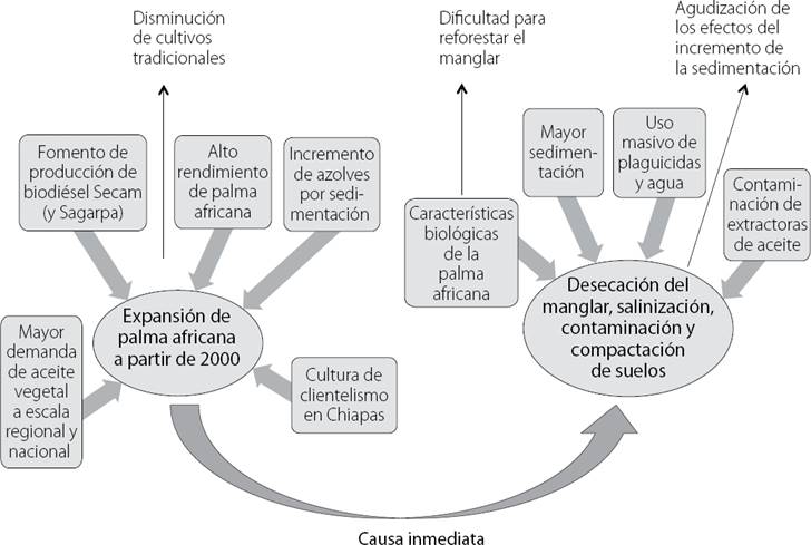 El Diagrama 2 muestra otro ejemplo de las consecuencias ambientales de una IPA ausente, es decir, la expansión masiva y acelerada de la palma africana —una especie no nativa que produce aceite vegetal comestible y materia prima para elaborar biocombustible (en este caso biodiésel) y otros productos— en las zonas de manglares. Los entrevistados coinciden en que este proceso es resultado de las políticas de fomento a la producción de aceite vegetal, sin considerar sus posibles impactos ambientales. Fue observado desde el año 2000 y su efecto directo es considerado serio por todos los expertos, ya que la extensión natural por semillas o por cultivo provoca la desecación de los manglares, el incremento de salinidad de los cuerpos de agua, así como la contaminación y compactación de los suelos, debido al consumo excesivo de agua y el uso de plaguicidas: