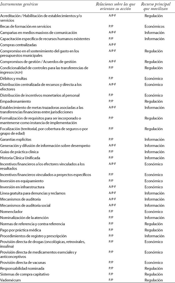Para identificar los instrumentos en cada uno de los dispositivos de políticas es necesario contar con una primera lista a partir de la cual analizar —en cada caso— su singular composición. Dicho de otro modo, se trata de descomponer los dispositivos en aquellos instrumentos genéricos a través de los cuales las grandes decisiones se traducen en mecanismos de provisión, financiamiento y regulación orientados a garantizar el cuidado de la salud de la población.