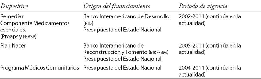 Se trata de tres dispositivos de políticas que actuaron en todo el periodo en los establecimientos estatales en el primer nivel de atención de la salud, dependientes de los estados provinciales o los municipios. El Programa Remediar lo hacía aportando medicamentos esenciales, capacitación y procedimientos de registro; el Plan Nacer empadronando y nominalizando a la población de grupos etarios determinados, para definir metas trazadoras y transferir recursos de manera directa a los equipos de salud en los CAPS según cumplimiento de resultados, y el Programa Médicos Comunitarios, con la incorporación de profesionales al equipo de salud y formando a otros ya incorporados en atención primaria de salud (APS). Se trata de iniciativas que actuaron de manera simultánea y contribuyeron con recursos de distinto tipo para moldear las prácticas de la atención.