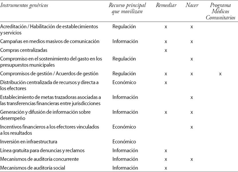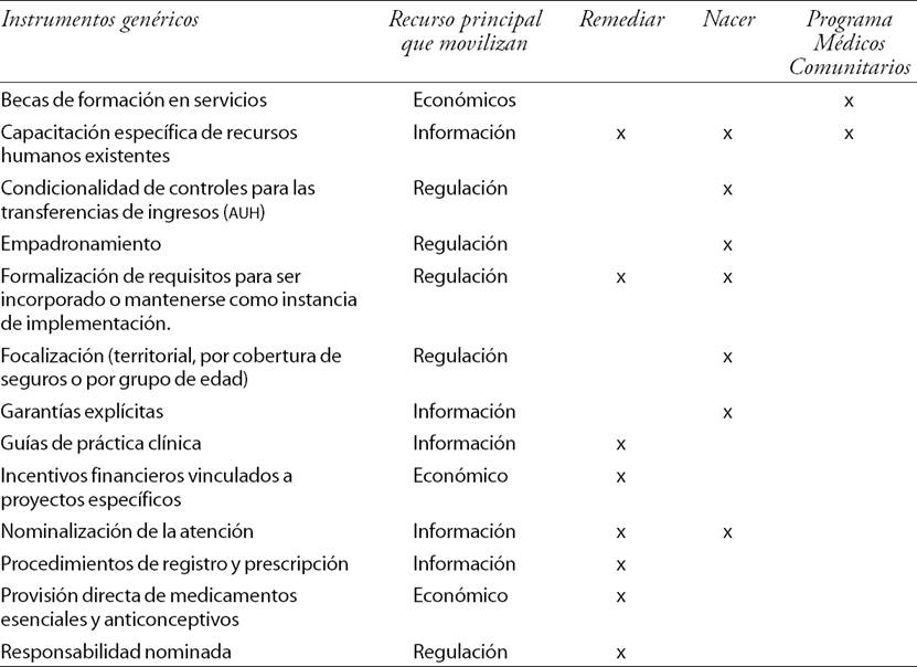 Aun omitiendo algunos programas y leyes de relevancia, este análisis muestra las posibilidades del análisis de los instrumentos para recomponer una (posible) visión de totalidad de la política nacional en el periodo 2003-2011. El foco está puesto en los instrumentos presentes en tres dispositivos en particular: el Programa Remediar, El Plan Nacer (posteriormente llamado Sumar) y el Programa Médicos Comunitarios (Cuadro 2).
