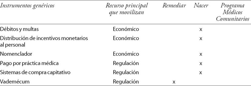 Dada la especificidad de los contenidos de nuestro campo de análisis, resulta necesario partir de una primera identificación del conjunto de instrumentos genéricos que movilizan las políticas de salud. La revisión de los dispositivos descritos en distintas investigaciones permitió delinear —siempre provisionalmente— una lista (maximalista) de instrumentos genéricos que se presenta en el Cuadro 1. Los trabajos de Braun y Etienne (2006) y Forest (2005) son una contribución relevante, ya que ponen el foco en las políticas de salud.