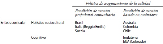 Con base en el estudio de casos se identifican a grandes rasgos dos tendencias en las políticas de aseguramiento de la calidad en educación inicial. Por una parte, el análisis de los resultados evidencia que existe un modelo que se ha denominado “rendición de cuentas basado en estándares”, asociado a los casos de Australia, Colombia, Chile, Estados Unidos-Colorado e Inglaterra. Por otra parte, el estudio identifica un enfoque de “rendición de cuentas profesional-comunitario”, cercano a los modelos implementados en Brasil, Italia Reggio Emilia y Suecia.