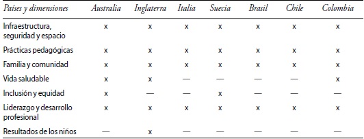 Las dimensiones evaluadas en los distintos casos se centran en elementos de calidad estructural y de proceso, evidenciando una visión holística de la oferta educativa. Las dimensiones de inclusión y equidad y de vida saludable aparecen como más innovadoras y no son transversales a todos los casos. El único país que incorporó temporalmente la evaluación de resultados de los niños en su sistema es Inglaterra, lo cual implicó importantes críticas al interior del país.