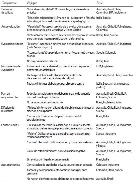 En este apartado se comparan los sistemas de aseguramiento de la calidad de los diversos países estudiados de acuerdo con los siguientes componentes: autoevaluación, evaluación externa, instrumentos evaluativos, plan de mejoramiento, difusión de los resultados, consecuencias, asesoría técnica y acompañamiento.
