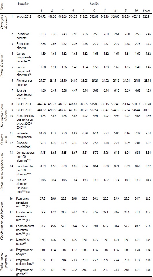 El modelo tres se estimó con cinco factores del sistema educativo que agrupan 21 variables cuyos valores promedio por decil se muestran en el cuadro 1. Los factores son: a) gestión de insumos, que incluye la formación de docentes, b) desempeño del sistema educativo medido por el rezago escolar de los alumnos por escuela, c) el contexto social de cada escuela, d) el equipamiento de las escuelas y e) los programas que recibe cada escuela. Las variables usadas son las siguientes: