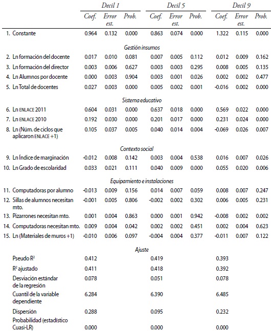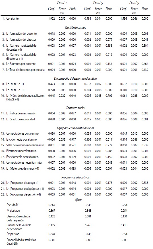 Los parámetros no significativos en dos de los tres deciles corresponden a las variables: (4) carrera magisterial de los docentes, (16) pizarrones que necesitan mantenimiento y (17) equipos de enciclomedia que necesitan mantenimiento.