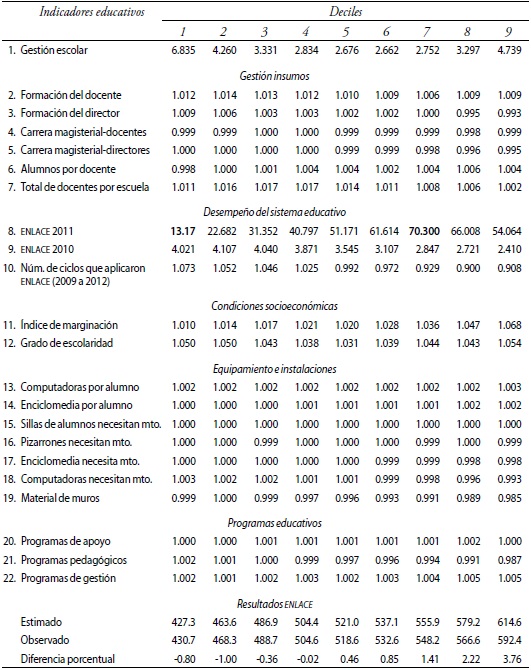 El valor de los indicadores para las 21 variables y la constante de los nueve modelos estimados se muestran en el cuadro 4. En la última fila del cuadro 4 se muestra que el desempeño estimado por decil, , reproduce el desempeño promedio observando por decil de escuelas ; las diferencias, , para los nueve modelos están en un rango de 0.2 y 3.76 por ciento.
