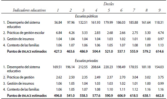 El modelo estimado permite separar la aportación individual de cada variable y su contribución conjunta en los factores escolares y no escolares. En este apartado se presentan indicadores que valoran el efecto de los parámetros estimados en el valor promedio de las variables explicativas señaladas en el cuadro 1. En general, para cada promedio de la variable j, en el decil (d), el indicador de la variable es: . De esta manera, para cada modelo descrito en la expresión (3) se obtiene el desempeño estimado promedio de los deciles de escuelas con la expresión (4):