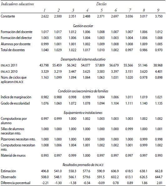 La prueba ENLACE de 2011 muestra un parámetro de 0.43 para el primer decil y de 0.63 para los deciles cinco y nueve. Estos parámetros son elasticidades; para el primer decil indica que un aumento de uno por ciento en el resultado de ENLACE de 2011 implicaría un aumento de 0.43 por ciento en el resultado de la prueba en 2012. Para los otros dos deciles, el aumento sería de 0.63 por ciento. Estos valores señalan como se construye el rezago educativo, ya que cuanto menor sea el resultado promedio de la prueba en un ciclo escolar menor será el resultado esperado para el siguiente ciclo escolar. Este resultado señala la necesidad de tener estrategias en las escuelas que recuperen los rezagos de los alumnos.
