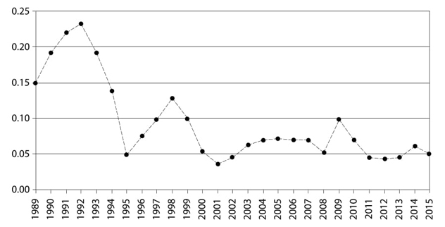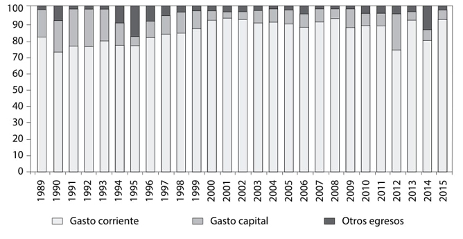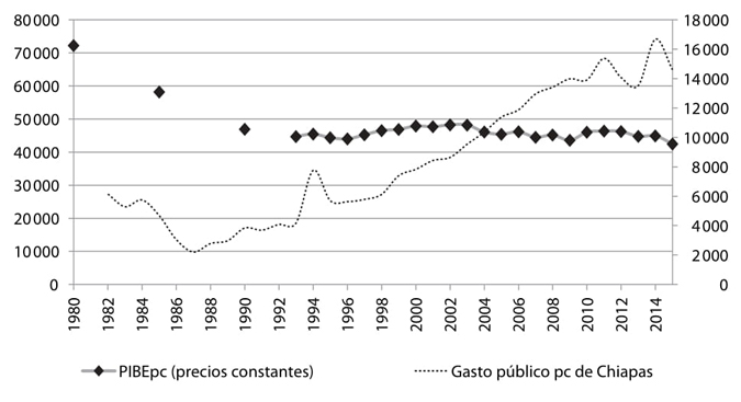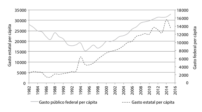 La tendencia creciente del gasto público estatal per cápita a partir de la década de 1990 contrasta con la del pibe, que disminuye en la década de 19807 y se mantiene constante en las dos décadas siguientes. Si en la década perdida el gasto público estatal varía de forma procíclica, disminuyendo con el PIB per cápita de la entidad, a partir de 1990 la correlación entre las dos variables se anula, pues el gasto sigue creciendo y el PIB se mantiene constante.