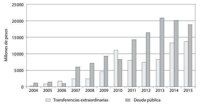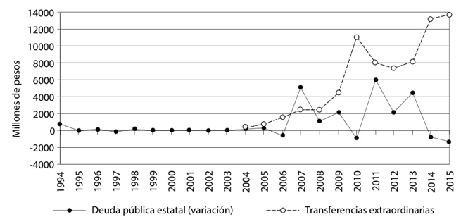 Si bien la recepción de transferencias extraordinarias es creciente en el tiempo, el flujo anual de éstas no es constante. Según la gráfica 10, la reducción del acumulado anual de la deuda pública estatal parece estar en función de la llegada de estos recursos. Se observa que el flujo de las transferencias es proporcional al acumulado anual de la deuda, al mismo tiempo existe una relación inversa entre ellos. Un ejemplo claro es el notorio crecimiento de las transferencias extraordinarias de 2009 a 2010 y de 2013 a 2014, el cual significó una reducción neta del acumulado de los pasivos. Por otro lado, a medida que el flujo de estos recursos federales se detiene, la deuda estatal acumulada vuelve a crecer.17