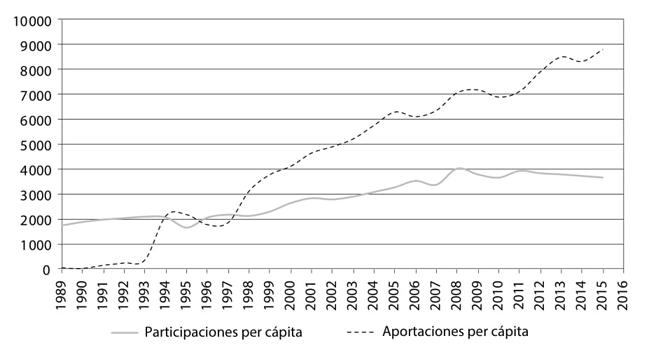 De 1993 a 2015 las aportaciones federales per cápita se multiplicaron por 24.5 mientras que las participaciones federales per cápita lo hicieron en 1.7 veces en el mismo periodo. Eso significa que la causa principal del incremento del gasto estatal es la descentralización fiscal de servicios públicos importantes, como la educación básica y la salud.