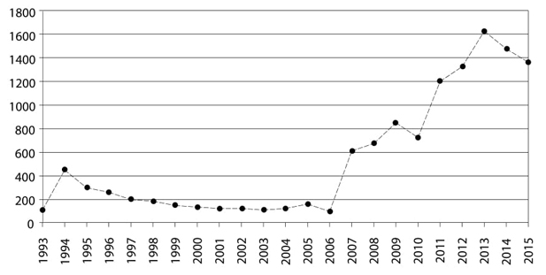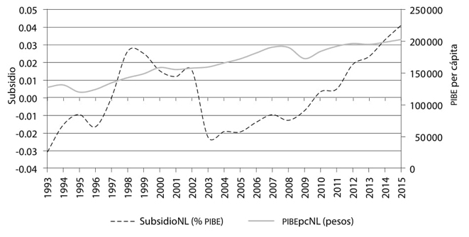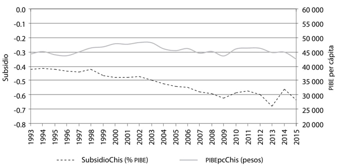 Como se muestra en la gráfica 6, el estado de Chiapas está subsidiado por la federación. Por ejemplo, en el periodo 1995-2006,10 la entidad aportó a la RFP únicamente 0.35 por ciento del total, una cuota insignificante. En el mismo periodo Nuevo León entregó a la RFP 8 por ciento (en ambos estados la población representa 4.1 por ciento del total del país). En el estado de Chiapas el subsidio como porcentaje del pibe11 representó, en 1993, -42.9 por ciento, y pasó a representar - 64 por ciento en 2015, por lo tanto la entidad ha estado cada vez más subsidiada y dependiente. Consideramos que esta importante inyección de recursos públicos a favor de un estado pobre como Chiapas se justifica por la necesidad de una redistribución territorial de los ingresos a través de las finanzas públicas en el intento de reducir el gran desequilibrio fiscal horizontal que caracteriza nuestro país. En Nuevo León por el contrario, el índice de subsidio en 1993 fue de -3.1 por ciento, pasando a 4 por ciento en 2015, lo cual indica que este estado es ahora un financiador neto de las finanzas centrales, en medida creciente en los últimos años.