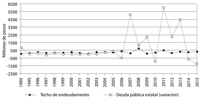 A raíz del rescate fiscal generalizado de los estados del país en plena crisis del “efecto tequila” en 1994-1995, los gobiernos estatales beneficiados se comprometieron en 1995 a imponer límites al endeudamiento público subnacional (Hernández et al., 2002). El congreso legislativo del estado de Chiapas acordó en ese entonces que el incremento anual de la deuda pública sería hasta un monto que no rebasara 25 por ciento del incremento anual de la sumatoria entre participaciones federales e ingresos propios, techo que en 2013 se redujo a 15 por ciento.