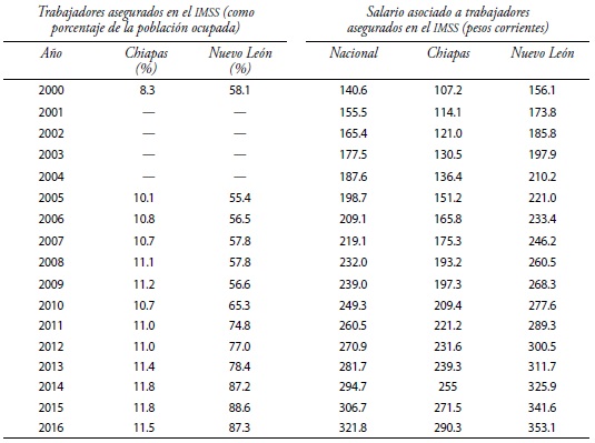 En el cuadro 3 se muestra el porcentaje de trabajadores asegurados en el Instituto Mexicano del Seguro Social (IMSS) y el salario asociado de éstos en la institución, en el periodo 2000 a 2015, y se compara la situación en Chiapas y Nuevo León.