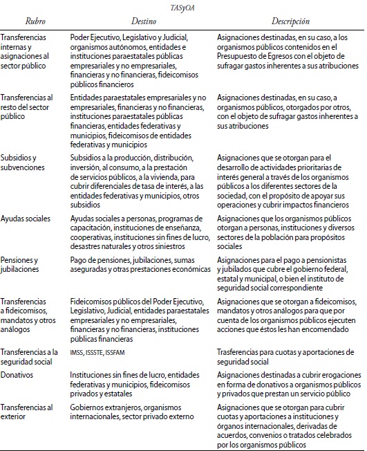 De acuerdo con el Clasificador por Objeto del Gasto para el Ejercicio Fiscal 2016 del Periódico Oficial (2016) de la Secretaría de Hacienda del Estado de Chiapas el fondo de las TASyOA se compone según el cuadro 4.