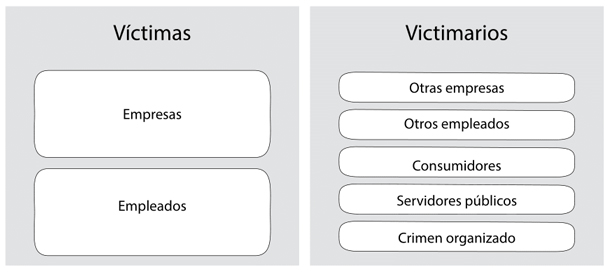 Dada la amplitud de delitos y circunstancias en que una empresa puede ser víctima de un delito, para efectos de proceder sistemáticamente y con suficiente claridad conceptual Mugellini (2012) presenta una tipología de las víctimas y los victimarios de los delitos cometidos contra las empresas (diagrama 1) . Nótese que en esta tipología, tanto las empresas como los empleados pueden ser víctimas y victimarios.