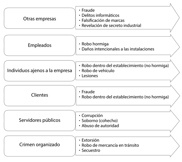 Esta tipología nos permite conocer y distinguir entre tipos de victimarios, lo cual nos ayuda a definir acciones de política de prevención delictiva contra las empresas (Gill, 1998; Chenery et al., 1996; Tilley, 1993; Trickett et al., 1992). También ayuda a deducir con mayor claridad cuál es el tipo de delito más esperado por tipo de victimario (diagrama 2).