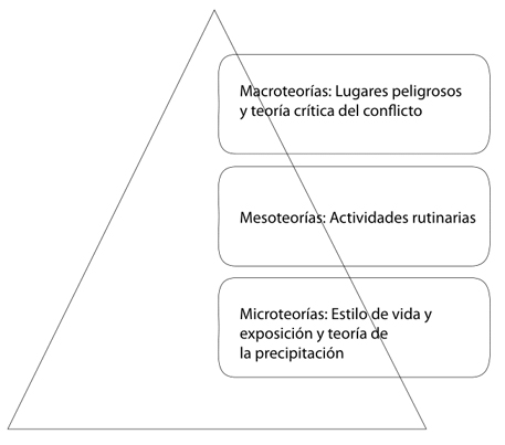 Estas teorías se pueden clasificar entre microteorías o teorías conductuales del comportamiento criminal, y macroteorías o teorías estructurales de la actividad criminal. A las teorías que conectan ambos niveles se les denomina mesoteorías. La teoría del estilo de vida y exposición y la teoría de la precipitación son microteorías (o teorías conductuales) porque pretenden explicar las razones por las que algunas personas (o empresas) sufren más delitos que otras sobre la base de sus comportamientos o rutinas. En cambio, las teorías de los lugares peligrosos y la teoría crítica del conflicto son teorías macro porque centran sus explicaciones en condiciones estructurales, a veces llamadas condiciones sociales. Por otro lado, la teoría de las actividades rutinarias se clasifica como una teoría en ambos niveles de análisis porque analiza la operación de los comportamientos y las elecciones (por ejemplo elección racional) de las víctimas y de los victimarios en relación o como resultado de la mediación de las condiciones ambientales de los lugares en donde sucede tal victimización (por ejemplo criminología ambiental) (véase el diagrama 3).