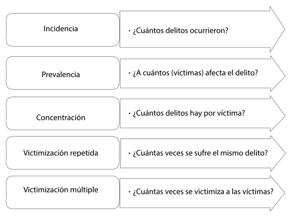 Como ya se adelantó, la incidencia es el conteo simple de eventos delictivos ocurridos en un periodo de tiempo. Con frecuencia se presenta como tasa, es decir, se divide el número de delitos entre el total de objetivos potenciales de victimización (por ejemplo personas, hogares, empresas, etc.) y se multiplica por mil, diez mil o cien mil. La prevalencia es la proporción de objetivos del delito que fueron de facto victimizados, es decir, es un cociente del número de víctimas entre el número total de objetivos potenciales de victimización. La concentración representa el número de victimizaciones realizadas por víctima, es decir, es el promedio de delitos por víctima. La victimización repetida refleja la frecuencia con que se victimiza a la persona, hogar o empresa por el mismo delito dentro de un mismo periodo. Finalmente, la victimización múltiple es una medición del mismo problema que el anterior, pero por delitos diferentes, es decir, la suma de todos los delitos cometidos contra la misma víctima en un periodo. Cada medición responde preguntas diferentes y ofrece elementos analíticos del problema también diferentes (diagrama 4).