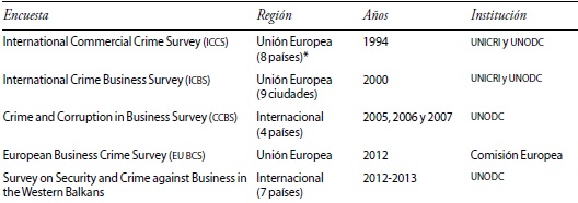 Conociendo la dificultad en el tema de la medición de la actividad delictiva contra las empresas, Mugellini (2012) aporta, entre varias cosas, una enumeración de las diferentes encuestas de victimización que existen al respecto y logra contabilizar un total de cinco. Éstas se muestran en el cuadro 1 y exhiben el predominio que posee la Unión Europea en la medición de este fenómeno, además de la importancia que tienen los organismos internacionales en este rubro.