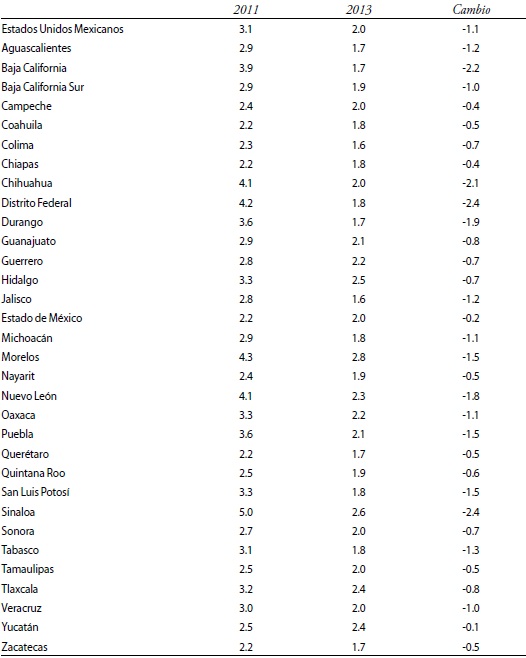 En términos de la relación entre 2011 y 2013 para este indicador de vulnerabilidad delictiva, a diferencia de lo que se vio en los niveles de prevalencia en cuanto a la ausencia de una correlación entre 2011 y 2013 en el ámbito de los estados, en este caso, para la concentración delictiva o promedio de delitos por empresa, sí se detecta una correlación entre años (cuadro 11). Es decir, en este caso, los promedios estatales de delitos por empresa victimizada en 2011 sí pueden predecir los promedios respectivos en 2013. Es decir, como patrón general, estados con altos niveles de vulnerabilidad delictiva por la vía de la concentración de delitos en 2011, también registraron niveles altos de vulnerabilidad delictiva en 2013.