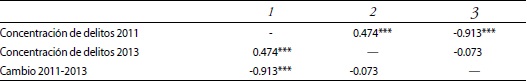 Pero una correlación incluso más fuerte, se puede detectar entre la concentración delictiva en 2011 y el cambio para el bienio 2011-2013. En este caso, se observa una correlación negativa y casi perfecta entre ambas variables, es decir, que a mayor concentración del delito (en unas pocas víctimas) en 2011, correspondió una mayor reducción en tal concentración del delito en 2013. Dicho de otra manera, los estados con altas cifras de concentración de delitos en empresas tuvieron los decrementos (o mejoras) más importantes en este indicador.