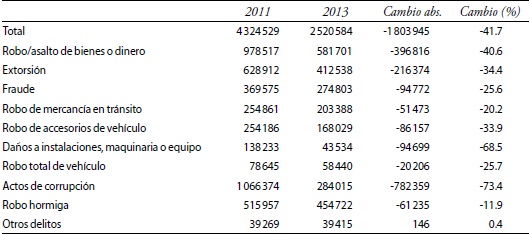 Finalmente, se muestra la incidencia por tipo de delito, lo cual nos lleva a observar la enorme reducción en el número de delitos reportados por las mismas empresas entre 2011 y 2013. No solamente se redujo la tasa de víctimas y el número de delitos por víctima, sino que se modificó sustancialmente la composición de los delitos cometidos contra las empresas. La reducción total es de 1.8 millones de delitos, equivalente a una reducción de casi 42 por ciento (cuadro 12). La mayor reducción en términos absolutos se presentó en los actos de corrupción, con casi 800 mil reportes de incidentes menos en 2013 frente a 2011, seguida por la reducción en los robos de bienes o dinero con casi 400 mil incidentes menos y de extorsiones con 200 mil incidentes menos.