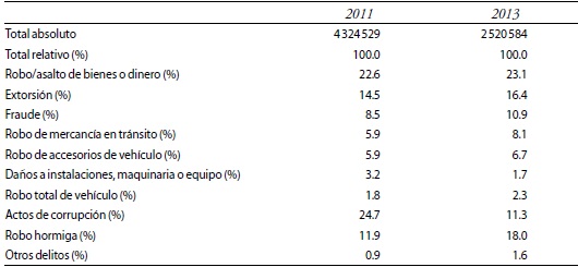 Así, tenemos que los delitos más frecuentes para ambos años son los robos y asaltos de bienes o dinero, las extorsiones, los delitos de corrupción, el robo hormiga17 y el robo total o parcial de vehículo, en ese orden. Estos delitos acumulan 61.8 por ciento de todos los delitos cometidos contra las empresas en 2011 y 2013. Específicamente, en este bienio, alrededor de uno de cada cuatro delitos fue un robo o asalto de bienes o dinero, uno de cada seis fue una extorsión, y uno de cada siete fueron delitos relacionados con actos de corrupción. Pero como es de esperarse, también hay diferencias notables por sector de la economía y por tamaño de la empresa. No todos los delitos ocurren con la misma frecuencia en todos los sectores de la economía y tipos de empresas según su tamaño. Estas variaciones composicionales requieren un estudio especializado y no general e introductorio como el presente. Igualmente, la reducción en el reporte de actos de corrupción requiere un mayor análisis, posiblemente con el uso de microdatos.