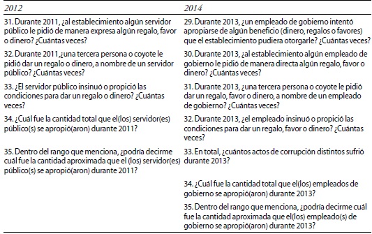 Es necesario aclarar aquí que el conjunto de preguntas en la encuesta dirigidas a medir los delitos de corrupción cambiaron parcialmente entre 2011 y 2013, pero es improbable, si no imposible, que estos cambios hayan influido en las posibilidades de comparación entre ambos levantamientos. Esto se deduce sobre la base de que estos cambios no son contradictorios ni excluyentes entre sí. El cuadro 14 muestra, para ambos años o vueltas de la encuesta, las preguntas contenidas en el módulo que existe expresamente al respecto de la corrupción. Se puede desprender de la lectura de las mismas que los agentes participantes de los actos de corrupción (servidor público, coyote, empleado de gobierno) y los objetos de los actos de corrupción (regalo, favor o dinero) son exactamente iguales en ambos levantamientos. Incluso, para el año en que se registró el descenso abrupto en los reportes de actos de corrupción, el número de preguntas consideradas en este módulo aumentó, haciendo también más precisa la detección de este tipo de actos. Por los motivos anteriores no podemos atribuir el descenso tan abrupto en el reporte de actos de corrupción a diferencias metodológicas en la encuesta.