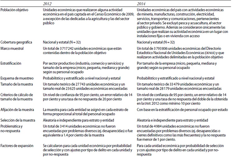 En México contamos con la Encuesta Nacional de Victimización de Empresas (ENVE), la cual ha sido levantada en dos ocasiones: 2012 y 2014. Esta encuesta posee información delictiva factual sobre eventos delictivos sucedidos durante 2011 y 2013, y de percepción (presente durante el levantamiento) y prospectiva en 2012 y en 2014. La institución encargada de realizar esta encuesta es el Instituto Nacional de Estadística y Geografía (INEGI). Los tabulados básicos, los cuestionarios (general y módulo de victimización) así como los documentos conceptuales y metodológicos (manual de operaciones de campo, marco conceptual, memoria de actividades y síntesis metodológica) se pueden hallar en la página del INEGI.7 Los elementos generales de esta encuesta se detallan en el cuadro 2.