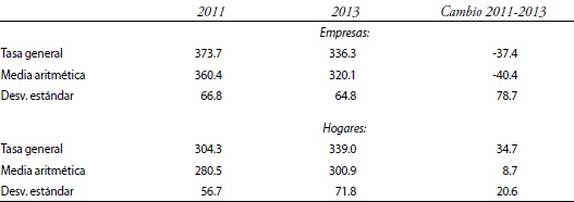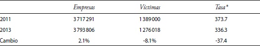 Empezando por la tasa de prevalencia delictiva, es decir, el número de empresas victimizadas entre mil, el cuadro 3 muestra que entre 2011 y 2013, esta tasa se redujo significativamente, por motivos de una reducción en el número de empresas victimizadas entre el total; cabe destacar que el número de empresas en el país en ese bienio aumentó 2.1 por ciento, pero la proporción de empresas víctimas del delito se redujo 8.1 por ciento.