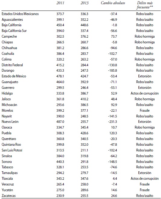 En cuanto a la distribución geográfica de esta victimización, e iniciando con 2011, tenemos que un total de quince estados en el país tuvieron una tasa superior a la tasa nacional de 373.7 unidades victimizadas por cada mil unidades económicas o empresas. En 2013, otra vez quince estados se hallaron por encima de la tasa media nacional, pero ahora de 336.3 empresas por cada mil, lo cual representa una disminución significativa en el ámbito nacional y muy importante para algunos estados en particular. Destacan las reducciones relativas en la victimización empresarial en Nuevo León, Durango, Nayarit, Sonora, San Luís Potosí y el Distrito federal, todos con reducciones mayores de 30 por ciento. No obstante, se registraron incrementos de victimización empresarial superiores a 20 por ciento en Puebla, Michoacán y Campeche. Nótese también que cada estado tiene su delito más frecuente (cuadro 4) y no todos adolecen en la misma medida de los robos o asaltos de dinero, bienes o mercancías. En algunos estados, el robo hormiga es el delito más común, mientras que otros sufren más de extorsiones (Estado de México, Guerrero, Nuevo León y Tamaulipas) y otros más sufren de fraude (Morelos, Veracruz y Yucatán) o bien de actos de corrupción (Hidalgo y Tlaxcala). En todo caso, entre 2011 y 2013 hubo una mejora muy notable en las tasas de victimización: una reducción de 37 empresas victimizadas por cada mil en sólo dos años y un total de 23 estados en donde se redujo la prevalencia en la victimización (mapa 1).