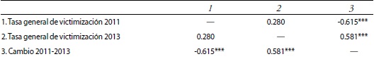 Acabamos de ver que la prevalencia delictiva se redujo significativamente entre 2011 y 2013 en el ámbito de los estados del país, pero que tales cifras estatales no se relacionan entre ellas, es decir que los niveles estatales de prevalencia delictiva en 2013 no pueden predecirse con base en los niveles de 2011. No obstante, sí se pudo detectar que aquellos estados que más redujeron sus tasas en el periodo fueron aquellos que en 2011, o al inicio del periodo, tenían los niveles de prevalencia delictiva mayores; o viceversa, es decir, fueron los estados con los mejores niveles de seguridad en 2011 los que registraron un menor nivel de reducción en sus tasas delictivas contra las empresas entre 2011 y 2013.