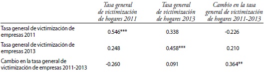Cabe por último presentar algunas correlaciones en el ámbito estatal entre las tasas de prevalencia en empresas y hogares. Por ejemplo, se debe mencionar la correlación positiva entre ambas tasas durante los dos años y para el cambio observado en el periodo, es decir, que como patrón general, se puede ver que los estados que poseen tasas elevadas de victimización contra empresas también poseen tasas elevadas para hogares (véase el cuadro 8).