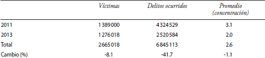 Esto nos lleva de forma natural a querer saber el número total de delitos cometidos cada año contra cada unidad de análisis victimizada, es decir, el promedio de delitos por empresa o la llamada concentración delictiva. La concentración de delitos por víctima es una medida adicional a la prevalencia y contribuye a estimar el grado de vulnerabilidad de las empresas en cada estado. Se entiende por vulnerabilidad delictiva la condición de incapacidad para evitar la victimización, en este caso, repetida o múltiple. Nótese que el promedio de delitos ocurridos entre víctimas o concentración del delito sólo puede ser superior a uno si la victimización es repetida o múltiple, es decir, si algunas víctimas fueron victimizadas en más de una ocasión por el mismo o por otro delito. Evidentemente un promedio de cifra mayor corresponde a un nivel mayor de victimización repetida o múltiple, es decir, un mayor grado de vulnerabilidad frente al delito.