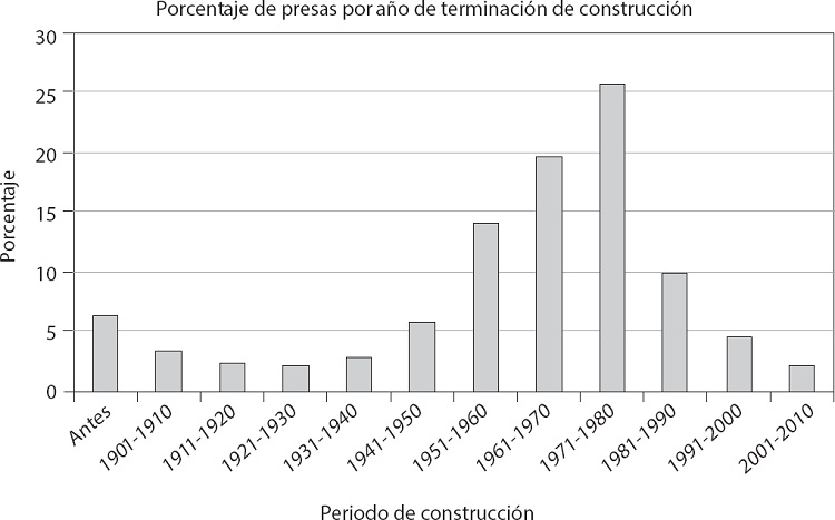 La gráfica 1 muestra el porcentaje de las presas construidas a partir de 1900 hasta la década de 2010, obsérvese el auge en las décadas de 1960 y 1970.