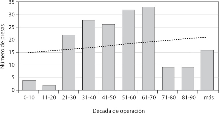 De las 181 grandes presas inventariadas tienen, en promedio, más de 57 años de operación (véase gráfica 10), superando el rango máximo establecido internacional (ICOLD, 2007: 44) y nacionalmente por la SHCP para su operación (50 años) (entrevista con funcionarios de Conagua, 2016).