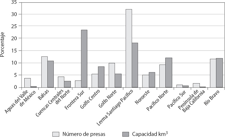 De las 181 presas inventariadas por la Conagua (2015: 105-109) la región que más presas concentra es la región hidrológico-administrativa Lerma Santiago Pacífico, pero es la Región Frontera Sur la que cuenta con mayor capacidad de almacenamiento, como puede observarse en la gráfica 2.