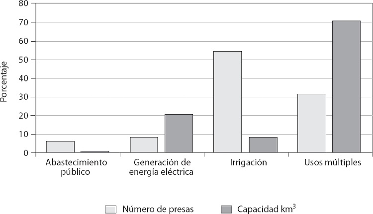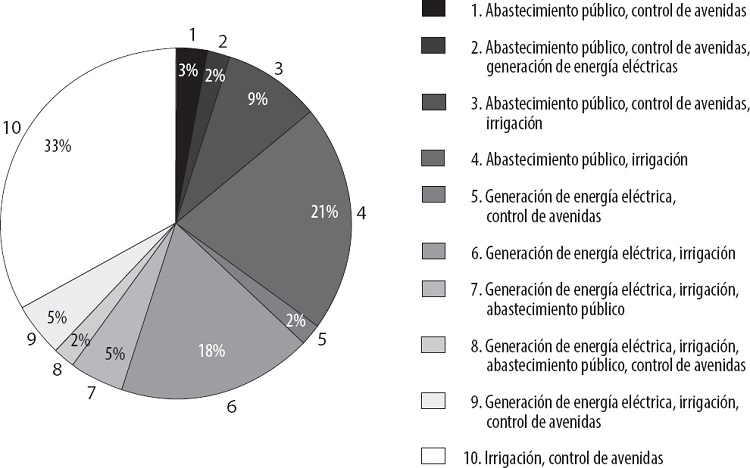 Se encontraron diez tipos de usos múltiples de las presas: irrigación-control de avenidas 33 por ciento, seguido de abastecimiento público e irrigación 21 por ciento y generación de energía eléctrica e irrigación 18 por ciento, como se muestra en la gráfica 4.