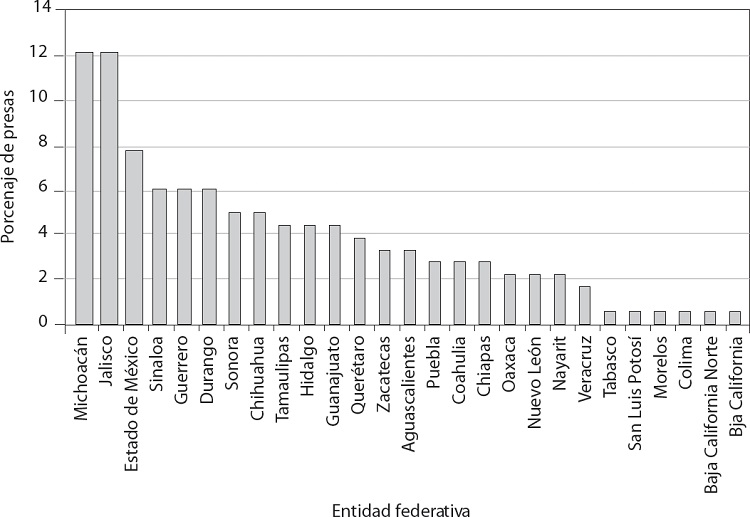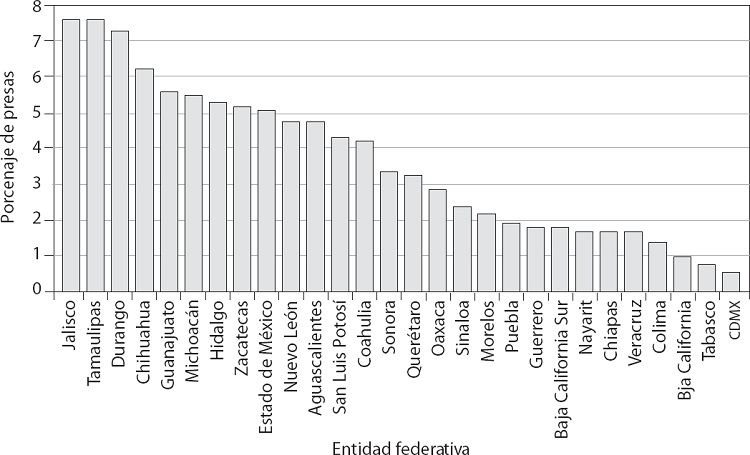 La gráfica 5 muestra en orden descendente el porcentaje de presas que se encuentran distribuidas en las diferentes entidades federativas de la república mexicana; Jalisco y Tamaulipas encabezan el listado con 7.5 por ciento de las 5166 presas del país, seguidos de Durango. Por otro lado, Baja California, Tabasco, Ciudad de México y Tlaxcala no alcanzan 1.0 por ciento y representan las entidades federativas con menor número de presas en el país respectivamente.