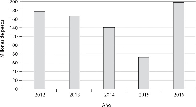 Del año 2012 al 2016 el programa K111 ejerció 760.6 millones de pesos con base en el presupuesto modificado como se ve en la gráfica 7.