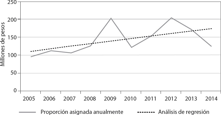 La Conagua en los últimos años ha tenido un crecimiento significativo en su asignación presupuestaria. Se ha pasado de un presupuesto en 2005 de 18617 millones de pesos a 49737 millones de pesos en 2014, que implica más del doble de su asignación original. En contraste, el programa K111, que es el programa para el mantenimiento y rehabilitación de presas en el país, en el mismo periodo ha recibido en promedio 151.7 millones de pesos, que contrastan con las necesidades de inversión estimadas en 325 millones anuales (Saavedra, 2014: 20); esta asignación además ha sido un tanto irregular como se ilustra en la gráfica 8.