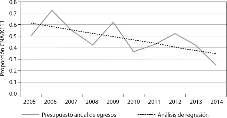 La proporción de recursos originales asignados a la Conagua y que ésta le asigna al programa K111 viene en descenso. Esto representa en promedio, en diez años, 0.48 por ciento del total de los recursos administrados por la Conagua, para alcanzar las necesidades de inversión estimada en más de 300 millones anuales.