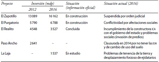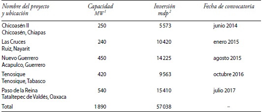 Por su parte, la Comisión Federal de Electricidad tiene programados cinco nuevos proyectos hidroeléctricos con una inversión aproximada de 1890 MW y 57934 millones de pesos, todos ellos con problemas sociales a su alrededor; Chicoasén II (con sindicatos que se disputan el transporte de pasajeros, la afiliación de empleados, el transporte de materiales y asociaciones con diversos intereses); Las Cruces (pospuesta por conflictos sociales con indígenas de la sierra nayarita, campesinos y pescadores, irregularidades en la EIA), Nuevo Guerrero (pospuesta por conflictos sociales), Tenosique (con desplazamiento de ejidatarios de la selva lacandona y afectación de 700 hectáreas con un impacto ambiental severo) y Paso de la Reina (en zona conflictiva por la reforma educativa).