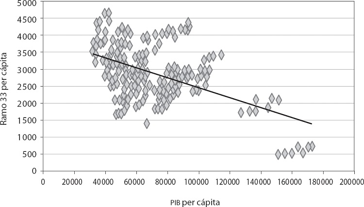 En este contexto, se hacen las siguientes propuestas: a) aumentar los recursos asignados al Ramo 33 como proporción del PIB. Con respecto a esto, el estudio muestra que el gasto público descentralizado, en forma del Ramo 33, ha aumentado gradualmente con los años y el aumento de recursos está asociado con menor desigualdad entre entidades y con mayor crecimiento a largo plazo. No obstante, el aumento tiene que ser suficiente no sólo para reducir la desigualdad entre entidades, sino también para revertir la divergencia de ingresos persistente entre éstas. b) Distribuir recursos entre y dentro de los estados con una correlación negativa y significativa entre el ingreso per cápita y el Ramo 33 per cápita. De hecho, hay evidencia de que los recursos asignados al ramo no están distribuidos con claridad de forma progresiva entre las entidades (véase la gráfica 1).